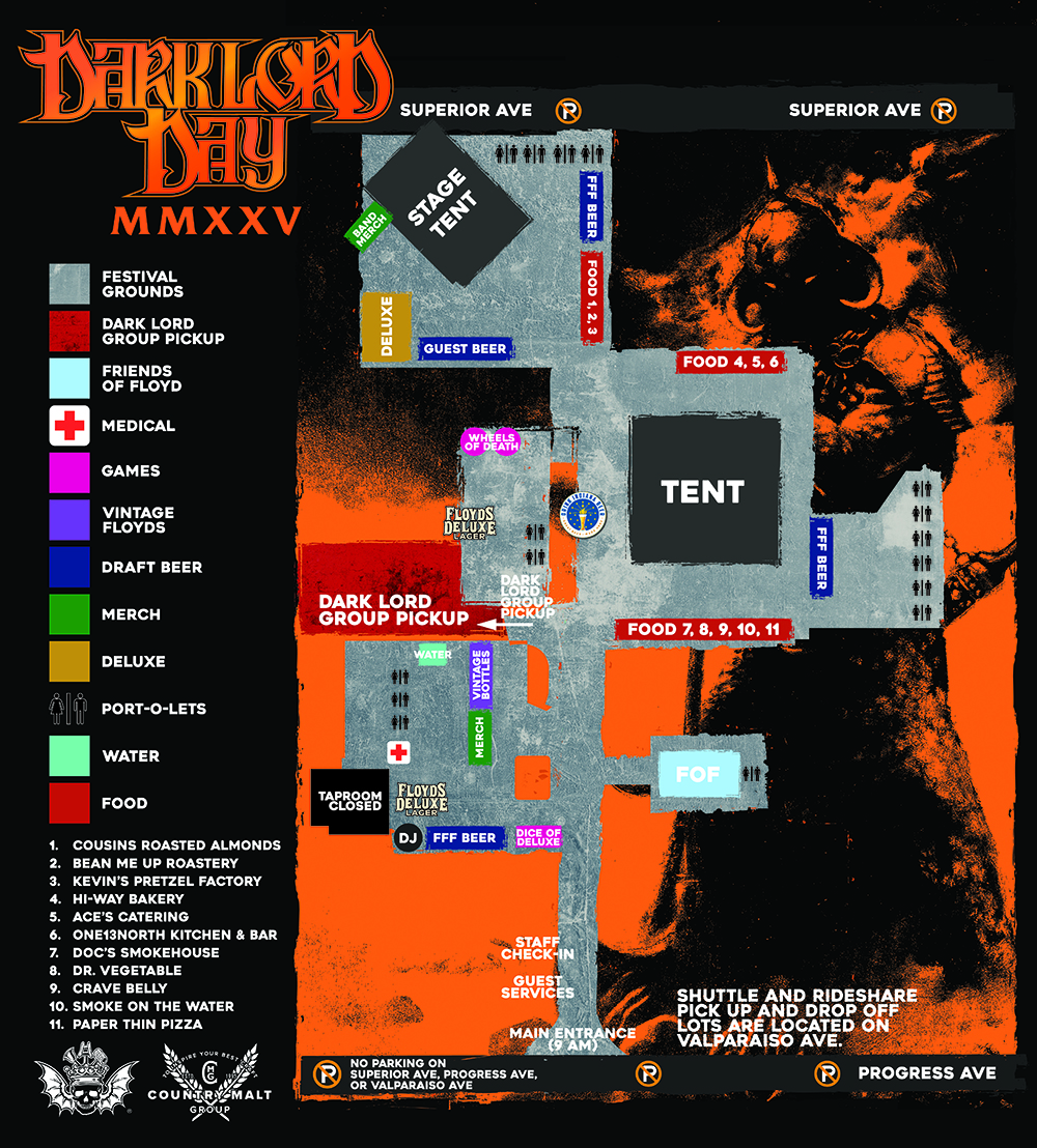 – Access to the Deluxe tent located in stage lot, which includes an exclusive bar featuring ultra-rare barrel-aged Dark Lord variants from the 3 Floyds vault for purchase, private restrooms, and a separate food tent